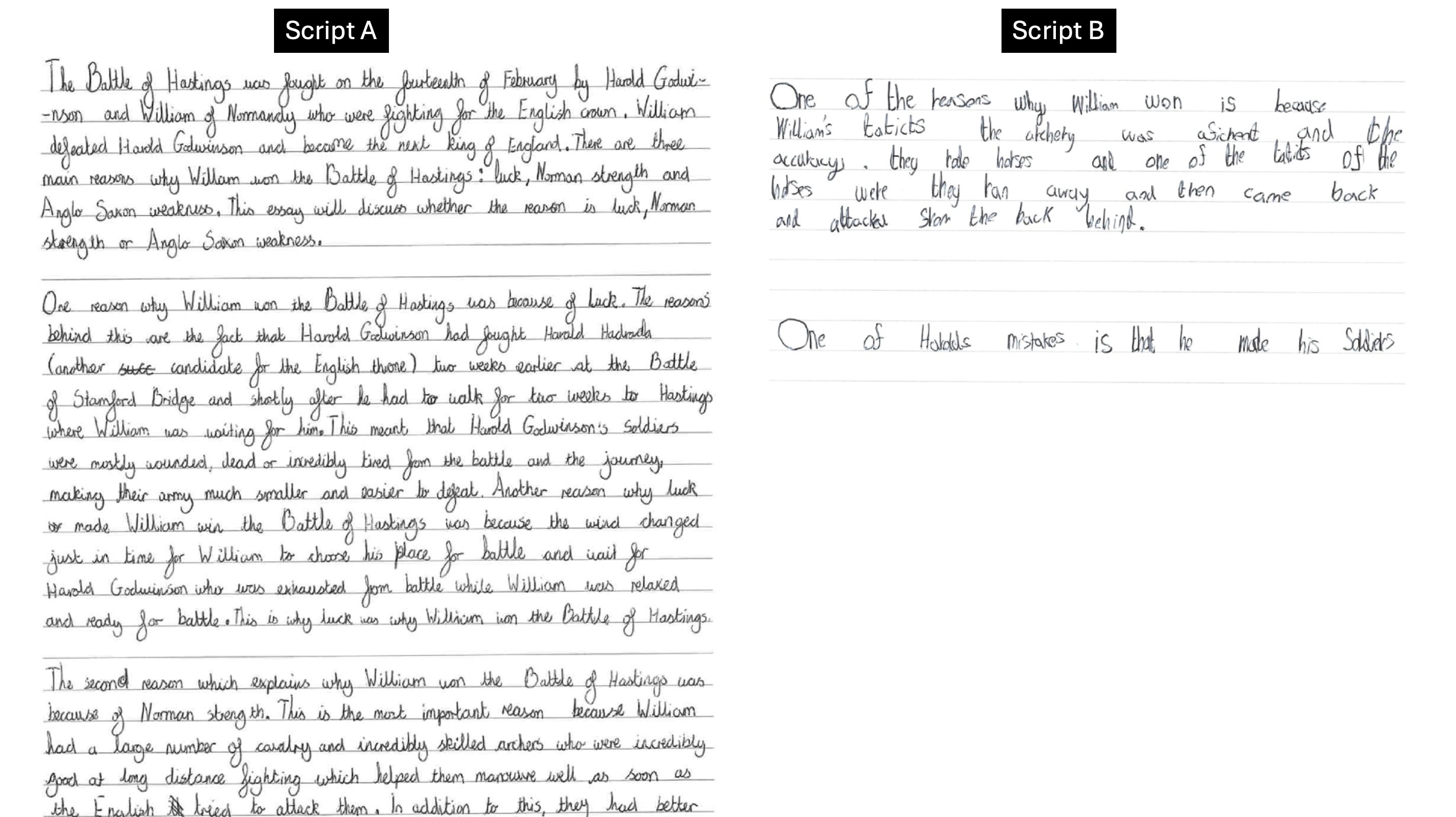Script A is the first part of one of the highest-scoring essays. Script B is the entirety of one of the lowest-scoring essays.
