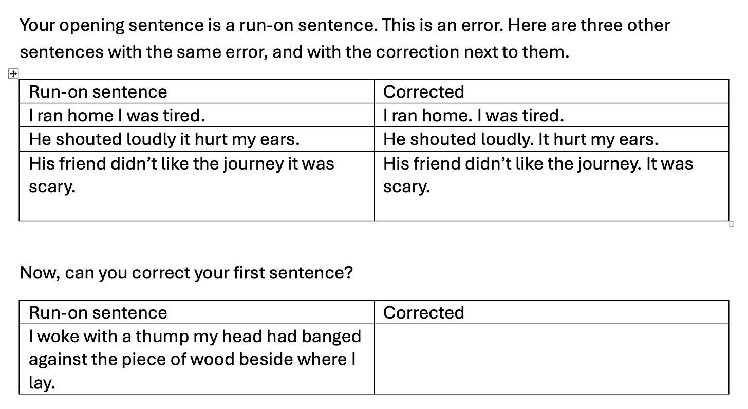 The AI produces some personalised but less specific advice about the content of the writing, where it is less likely to go wrong.